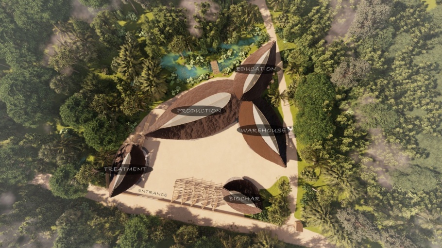 Das von Formitas unterstütze Digitalmodell basiert auf einem Entwurf von Studierenden der FH Münster, der die Eigenheiten von Bambus, Lehmbau und tropischer Bauweise berücksichtigt. In Skelettbauweise angeordneter Bambus über teils drei Stockwerke umfängt eine Produktionshalle, ein Lager, Sanitäreinrichtungen und einen Empfangsbereich auf der unteren Ebene sowie Büro, Ausbildungszentrum und Pausenraum in den oberen Segmenten.