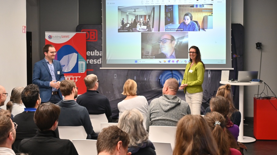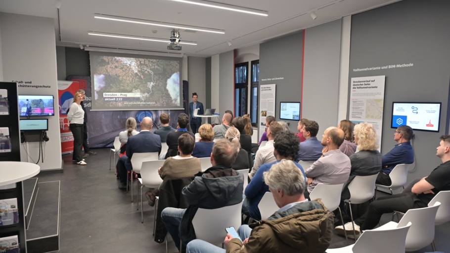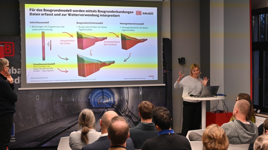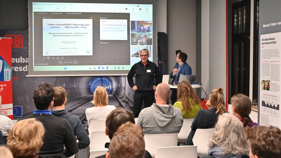 Unsere buildingSMART-Regionalgruppe Sachsen und ihr Gastgeber DB InfraGO AG hatten am 11. November 2025 zur zweiten Veranstaltung der Serie "BIM und die Neubaustrecke Dresden-Prag" in das DB Infozentrum der Neubaustrecke Dresden-Prag in Heidenau eingeladen. In fünf interessanten Fachvorträgen konnten ca. 35 Teilnehmerinnen und Teilnehmer spannende Einblicke in das diesjährige Thema "BIM und Geotechnik/Geologie" erhalten. Ein Thema, das noch nicht so sehr im BIM-Fokus steht, aber ein großes Potenzial in sich birgt. Die Betrachtung des Baugrundes ist für dieses ohnehin schon sehr interessante Neubauprojekt von sehr großer Bedeutung, da die Bahntrasse ab Heidenau in einem ca. 30 km langen Tunnel durch das Erzgebirge bis in das tschechische Chabařovice führen soll.