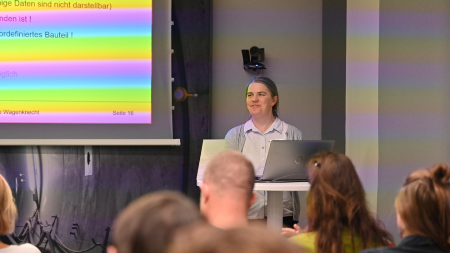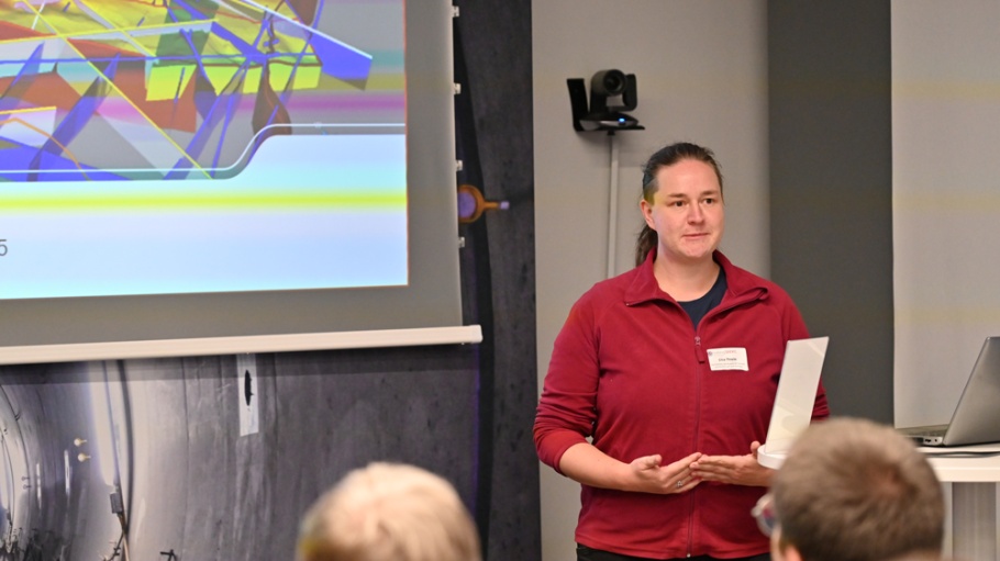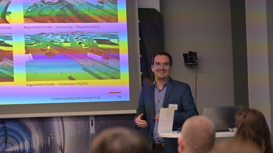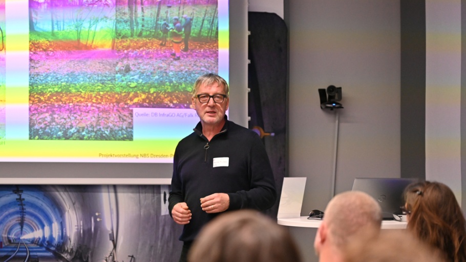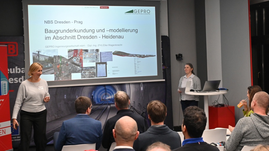 Nach der Begrüßung durch den Gastgeber und Vertreter der Regionalgruppe Sachsen gab Christoph Kautter, DB InfraGO AG, eine allgemeine Projektvorstellung und stellte die BIM-Anwendungen im Projekt vor. Im folgenden Vortrag von Vladislava Kostkanová und Falk Riedel, beide DB InfraGO AG, wurden aus Auftraggebersicht der Baugrund entlang der geplanten Eisenbahntrasse und dessen Besonderheiten vorgestellt. Im anschließenden Vortrag gaben Lisa Thiele und Sabine Kulikov, beide Sächsisches Landesamt für Umwelt, Landwirtschaft und Geologie (LfULG), einen Einblick über das Geologisches Modell als Grundlage für die Baugrundmodellierung. Besonders interessant waren die Hinweise auf die geologischen Anomalien im Betrachtungsgebiet.