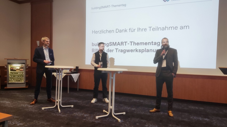 Dr.-Ing. Waldemar Weisheim (stahl + verbundbau GmbH) hob die hohe Detailtiefe, die Bedeutung der Verbindungstechnik und den hohen Automatisierungsgrad im Stahlbau hervor. Florian Willers (PIRMIN JUNG Deutschland GmbH) präsentierte den Holzbau anhand eines Studierendenwohnheims und Alexander Hofbeck (Bollinger+Grohmann) betonte für den Massivbau, dass in diesem Bereich noch sehr klassisch gearbeitet werde, der Massivbau von einer Vielzahl an Prozessen geprägt sei. Diese müssten zunehmend digital unterstützt werden.